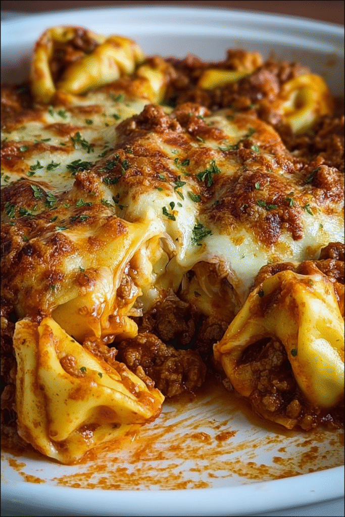 This comforting, cheesy baked tortellini casserole combines uncooked refrigerated cheese tortellini with savory ground beef and marinara sauce, all topped with melted mozzarella and cheddar cheese that bakes into golden, bubbly perfection. The recipe’s genius lies in its no-boil method—the tortellini cooks directly in the oven within the sauce, eliminating the pasta-boiling step and reducing both active cooking time and dishes to wash. With its straightforward preparation, everyday pantry ingredients, and guaranteed crowd-pleasing appeal that even picky eaters enthusiastically devour, this baked tortellini represents the perfect solution for busy weeknights, casual entertaining, or any occasion when you want soul-satisfying Italian-American comfort food without the complexity, time investment, or multiple pans that traditional baked pasta dishes often require.