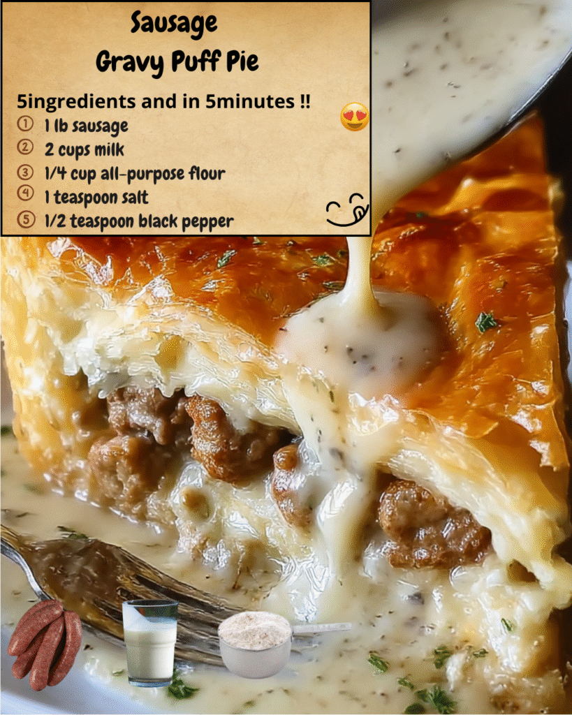 This Beef Sausage Gravy Puff Pie transforms the classic Southern breakfast combination into an elegant, golden pastry using hearty beef sausage instead of traditional pork. The flaky puff pastry encases rich, creamy gravy made with seasoned ground beef sausage, creating a substantial dish that combines comfort food flavors with impressive