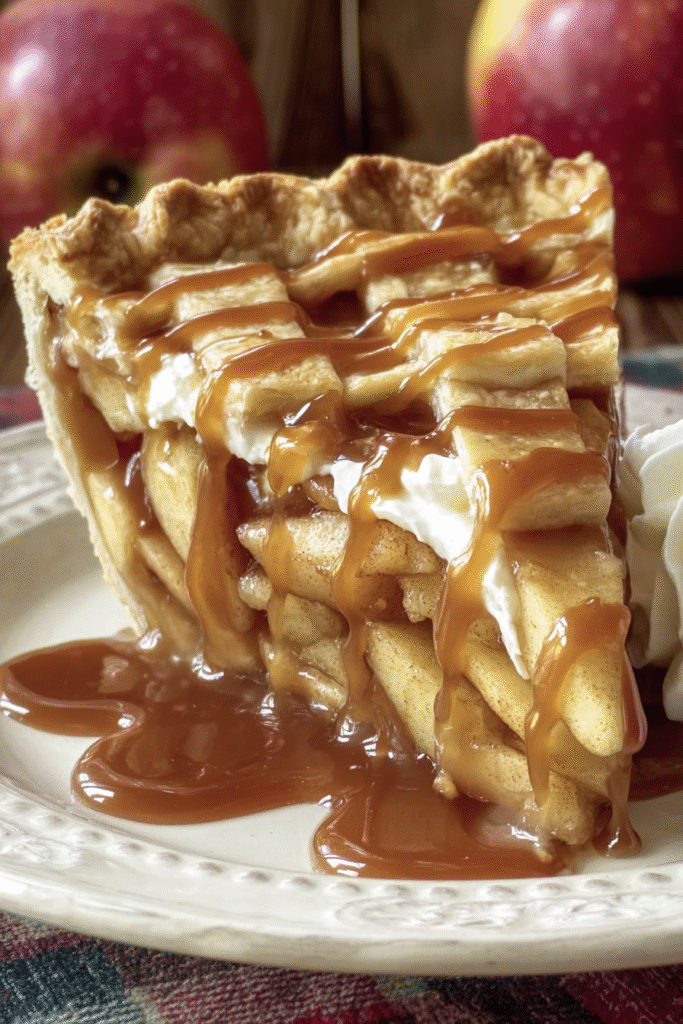 Caramel Apple Pie represents the pinnacle of American dessert baking, elevating a beloved classic through meticulous technique and the addition of luxurious homemade caramel that transforms familiar flavors into something extraordinary. This recipe demonstrates that exceptional pies don’t come from shortcuts or convenience products but from honoring proper methods—making real pastry from scratch, cooking fruit filling to proper doneness, and creating genuine salted caramel that delivers depth impossible to purchase in a jar. The time investment required for this pie makes it unsuitable for casual weeknight desserts but perfectly appropriate for occasions when impressive food creates memories and demonstrates genuine care for those gathered around your table. The combination of flaky, buttery crust, tender apples balanced between tart and sweet, and rich caramel sauce with sophisticated salt creates multiple layers of flavor and texture that satisfy on every level while capturing the essence of autumn’s abundance. Beyond its exceptional taste, this pie offers the satisfaction that comes from mastering traditional baking skills and creating something beautiful entirely by hand. The make-ahead friendly components allow breaking the project into manageable steps over 2–3 days, making even this ambitious recipe achievable for determined home bakers. Whether served at Thanksgiving, presented as a holiday gift, or baked simply because you crave the ultimate expression of apple pie excellence, this Caramel Apple Pie proves that sometimes the best rewards come from projects that challenge our skills and require our patience, resulting in food that transcends mere sustenance and becomes a genuine celebration of craft, tradition, and the simple joy of sharing something delicious made with love.