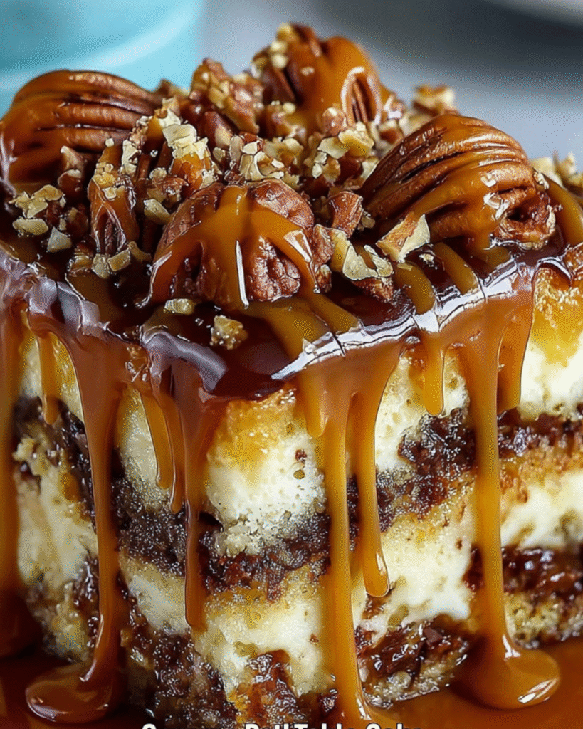 This decadent dessert reimagines the classic “Turtle” candy flavors—chocolate, caramel, and pecans—into a moist, crowd-pleasing sheet cake. A rich chocolate sponge is perforated while warm and infused with ribbons of caramel and chocolate syrup, ensuring every bite is gooey and flavorful. Topped with fluffy whipped cream and crunchy pecans, it