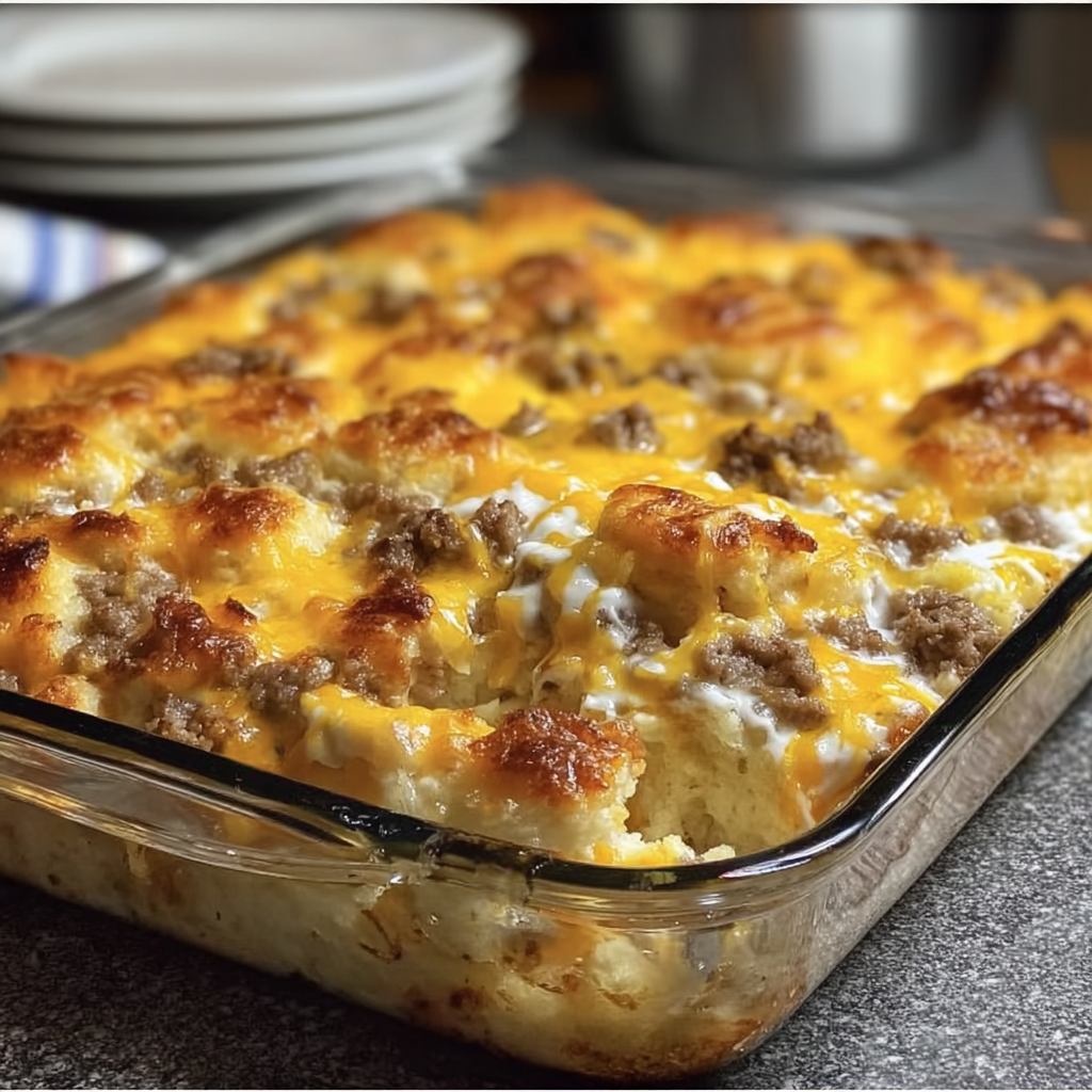 This Biscuits and Gravy Hashbrown Breakfast Casserole combines breakfast sausage, hashbrowns, biscuit pieces, and cheese