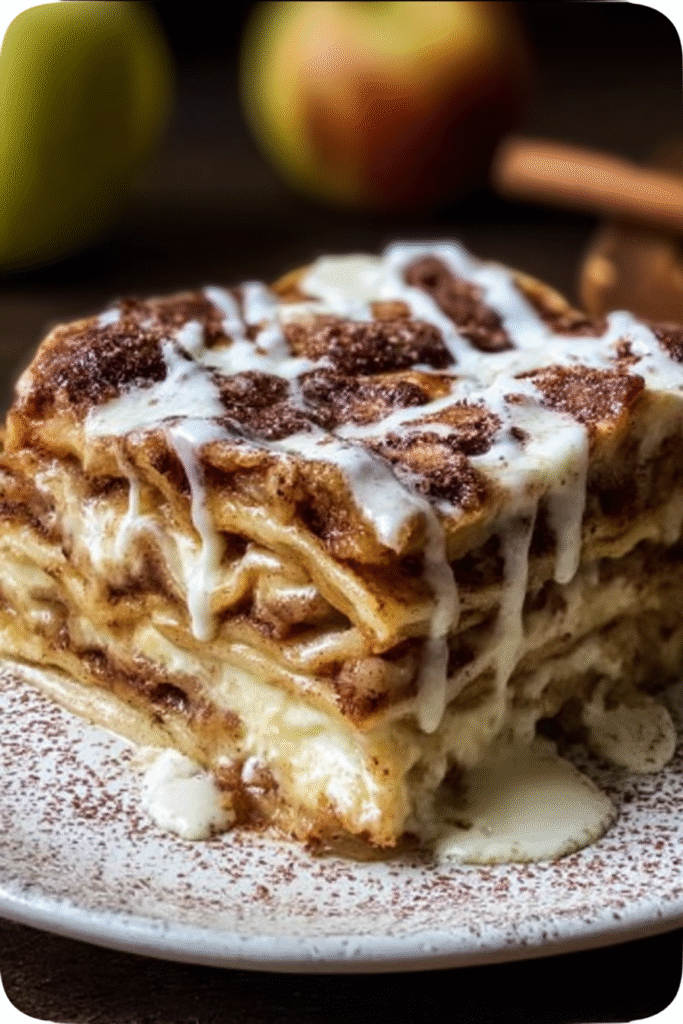 This Cinnamon Roll Apple Lasagna transforms ordinary refrigerated cinnamon rolls and canned apple pie filling into a stunning layered dessert that combines the best elements of cinnamon rolls, apple pie, and cheesecake into one show-stopping dish. The dessert builds in alternating layers—flattened cinnamon roll pieces form the “pasta” layers, spiced
