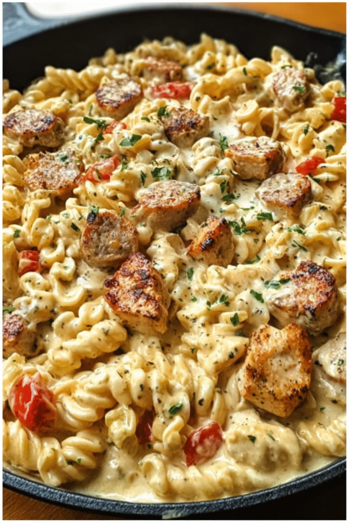 This Creamy Pepper Jack Chicken & Sausage Pasta combines diced chicken breast, sliced chicken sausage,