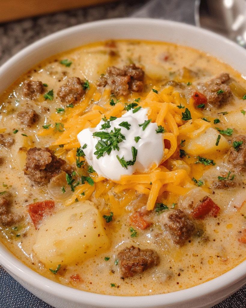 This hearty American comfort soup transforms the beloved flavors of a classic cheeseburger—seasoned ground beef, melted cheddar cheese, and tangy pickled notes from Worcestershire—into a creamy, spoon-able meal loaded with tender potatoes, carrots, and celery in a rich broth thickened with three types of dairy. The genius technique—browning beef with