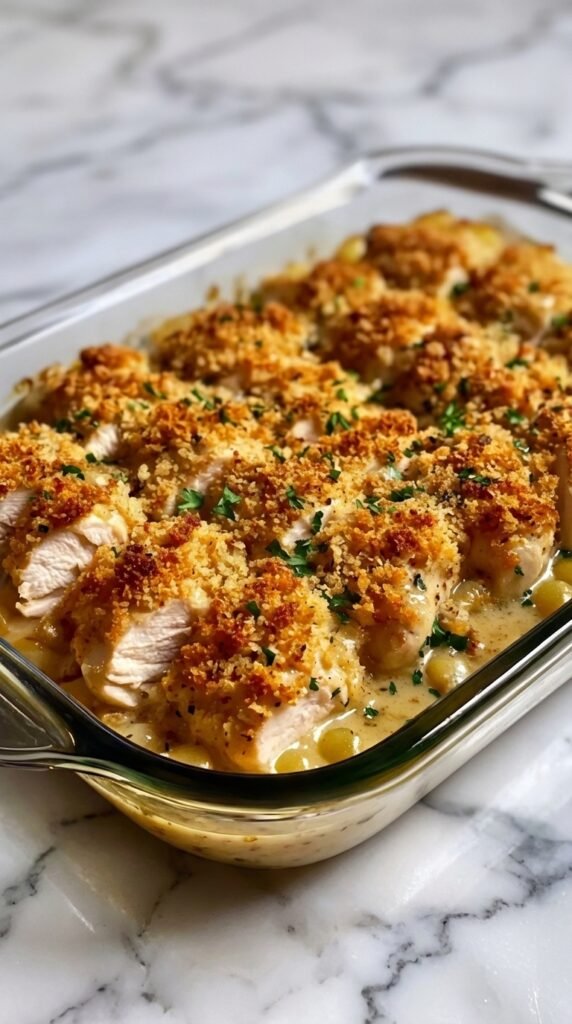 This ultimate American comfort food casserole layers juicy chicken breasts with a creamy sauce made