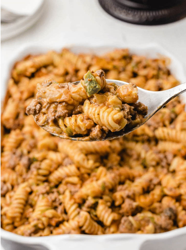 This hearty Midwestern comfort food classic combines seasoned ground beef, tender rotini pasta, sautéed onions