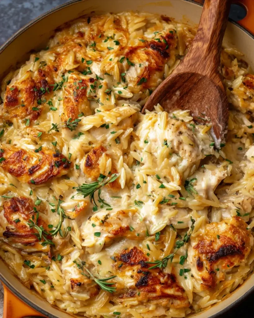 This ultimate comfort food combines tender chicken pieces, rice-shaped orzo pasta, aromatic vegetables, and a