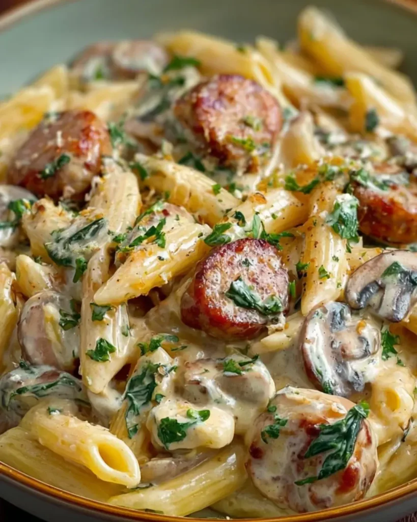 This comforting Italian-American classic combines crumbled Italian sausage and tender sautéed mushrooms with al dente