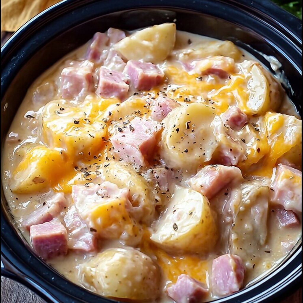 This Creamy Crockpot Turkey & Potatoes combines sliced potatoes with diced turkey, onions, and cheese