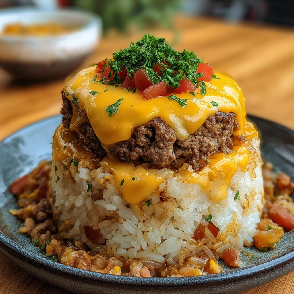 This Bacon Cheeseburger Rice Stack creates an impressive molded presentation that layers seasoned ground beef
