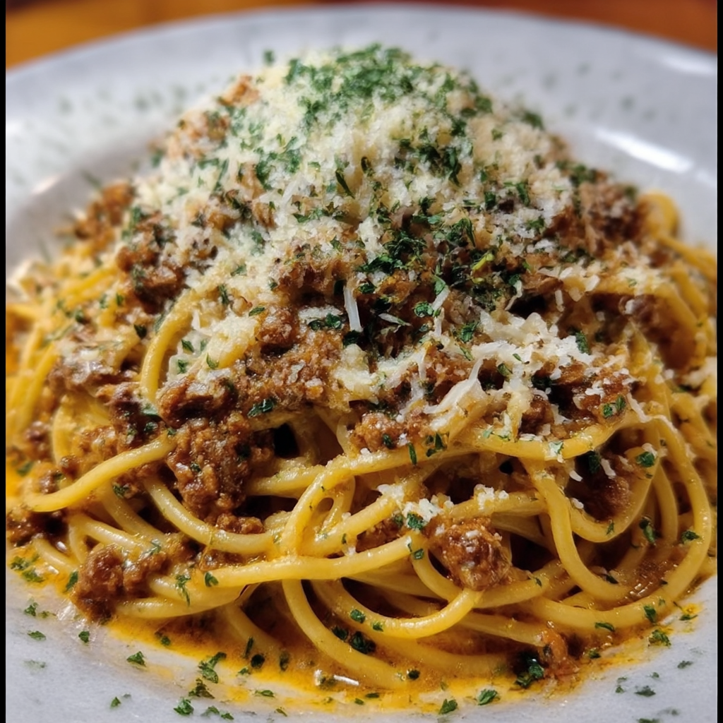 This Garlic Butter Parmesan Spaghetti with Savory Beef combines seasoned ground beef with a rich