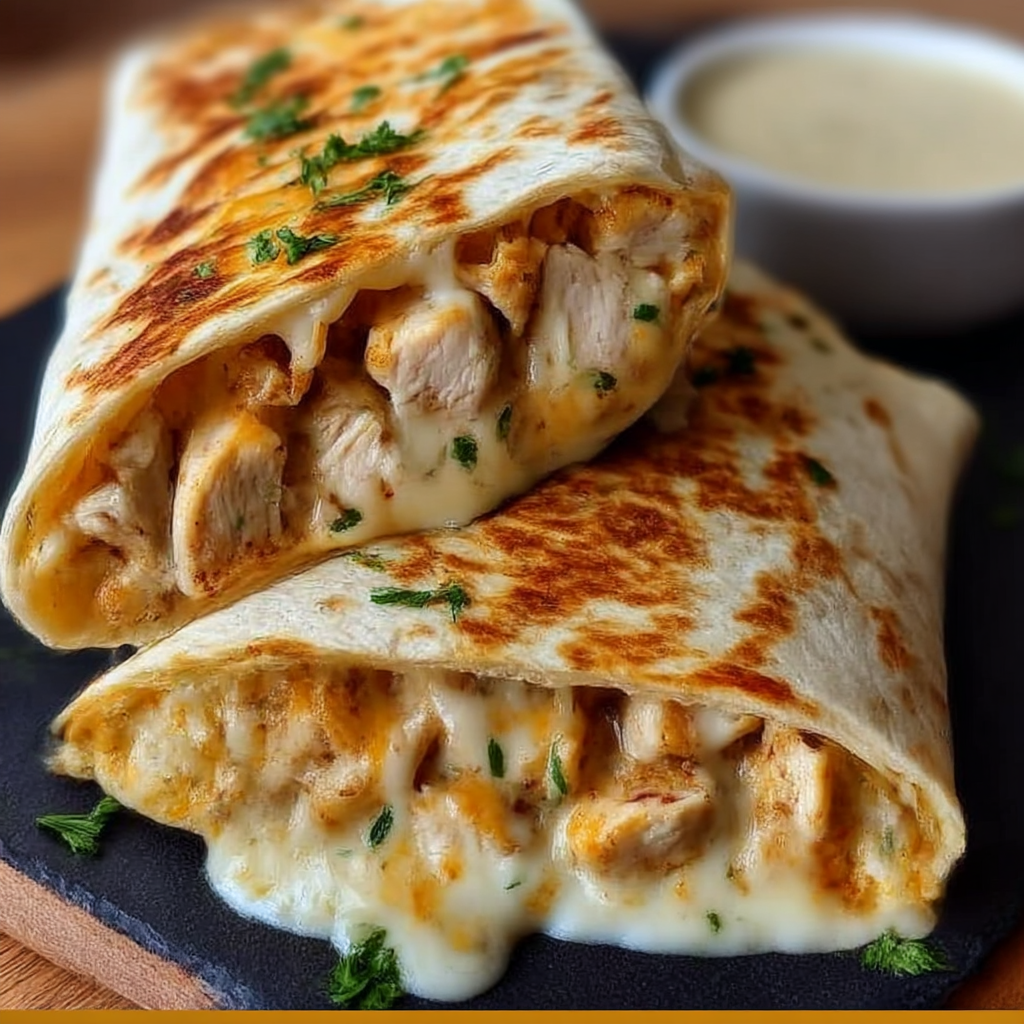 Cheesy garlic chicken wraps bring together juicy shredded chicken and a variety of cheeses, tucked into soft flour tortillas. Each wrap is coated in a fragrant blend of melted butter, minced garlic, and herbs before pan-toasting or oven-baking until golden and crispy. The result is a comforting handheld dish with