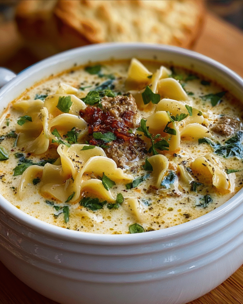 This creamy Alfredo lasagna soup transforms the beloved layered pasta dish into a comforting bowl