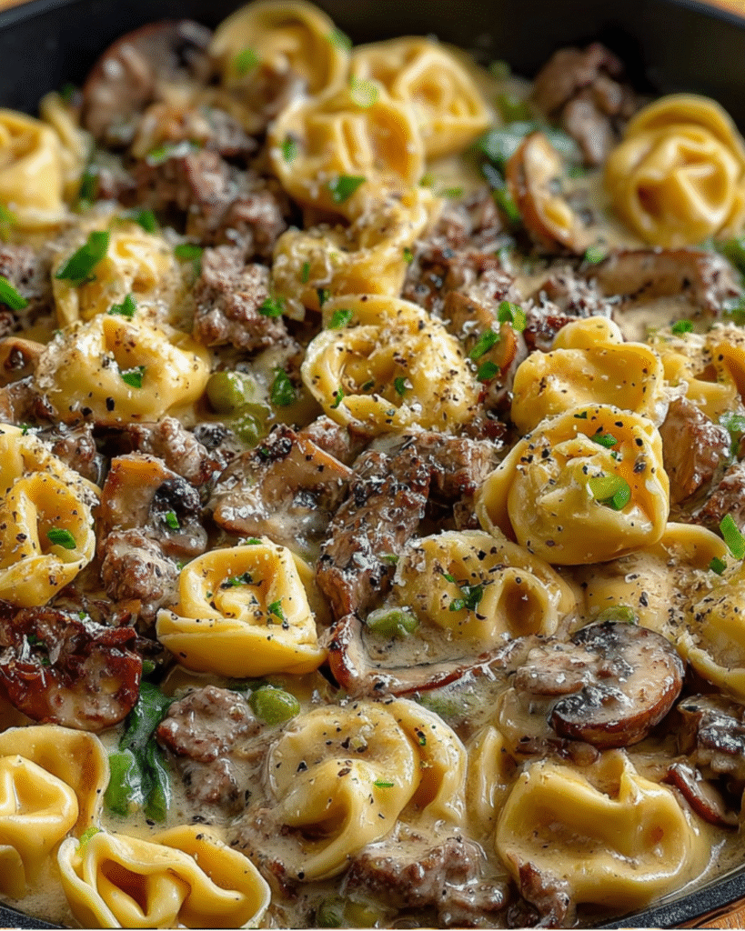This creamy beef and mushroom tortellini skillet brings together tender cheese-filled pasta, savory ground beef,