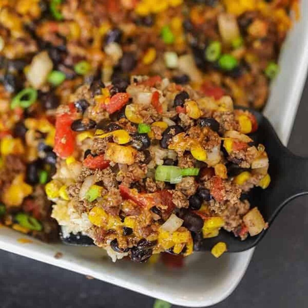 This Mexican-inspired one-skillet wonder combines seasoned ground beef with fluffy rice cooked directly in spicy