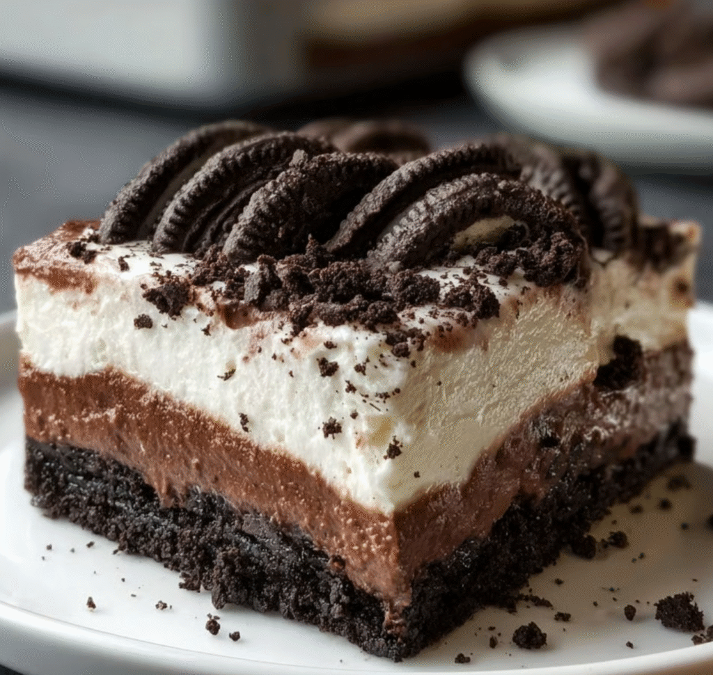 This decadent, no-bake dessert features four distinct layers of texture and flavor, starting with a