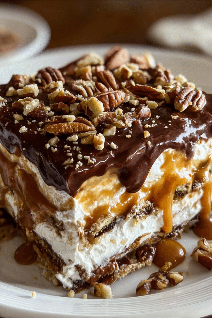 This no-bake turtle lasagna transforms the beloved flavors of turtle candies—chocolate, caramel, and pecans—into an