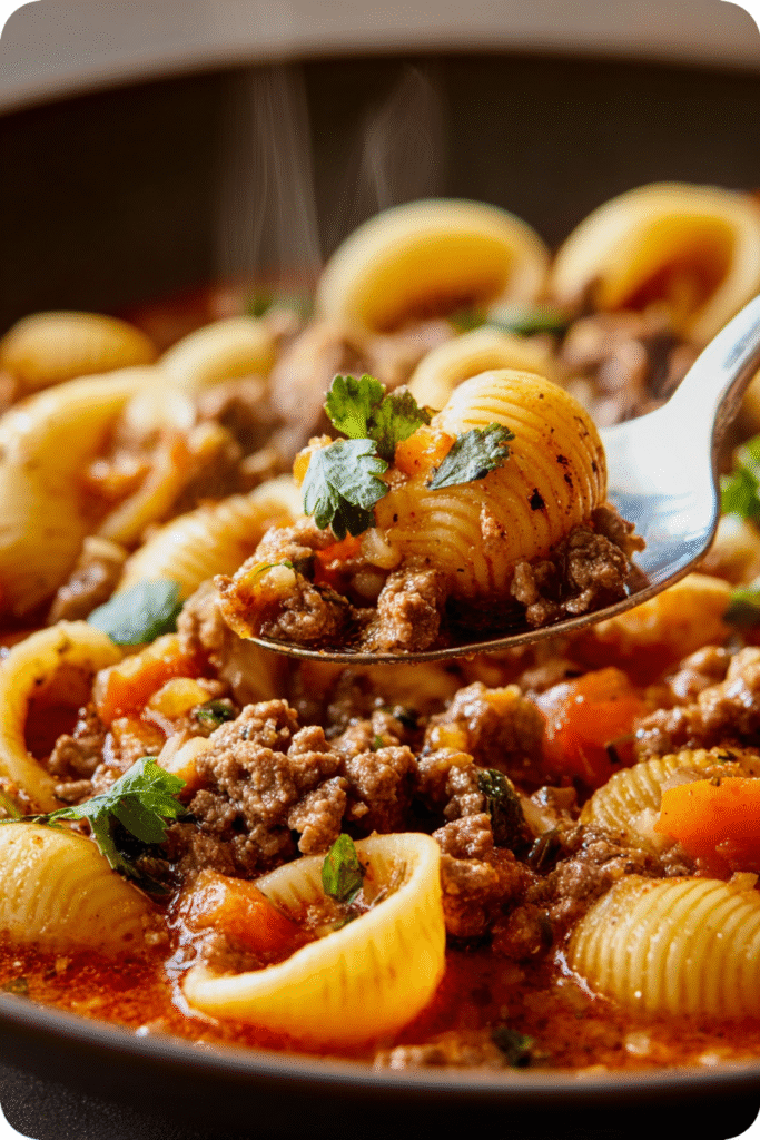 This beloved Mexican sopa seca features small shell pasta simmered in a richly seasoned tomato broth with tender ground beef, creating a hearty one-pot meal that’s equal parts comforting and flavorful. The pasta absorbs the savory spices and beef juices as it cooks, resulting in plump, sauce-coated conchitas that deliver