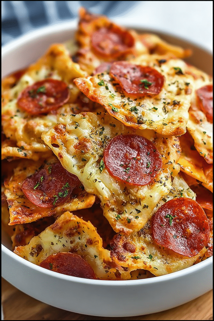 These Pizza Chips transform shredded mozzarella and Parmesan cheese into crispy, golden-brown bites topped with