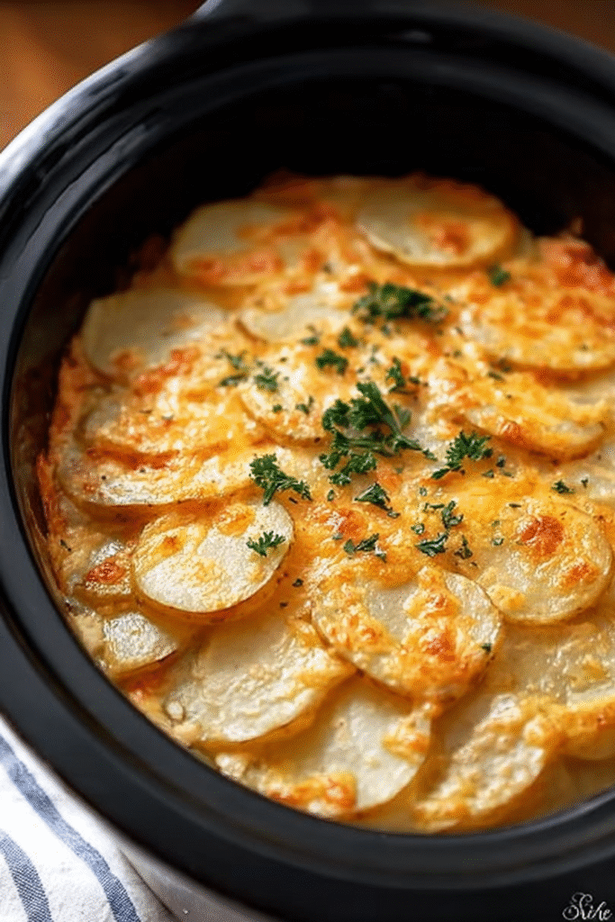 These Slow Cooker Scalloped Potatoes are a comforting, hands-off side dish featuring thinly sliced potatoes