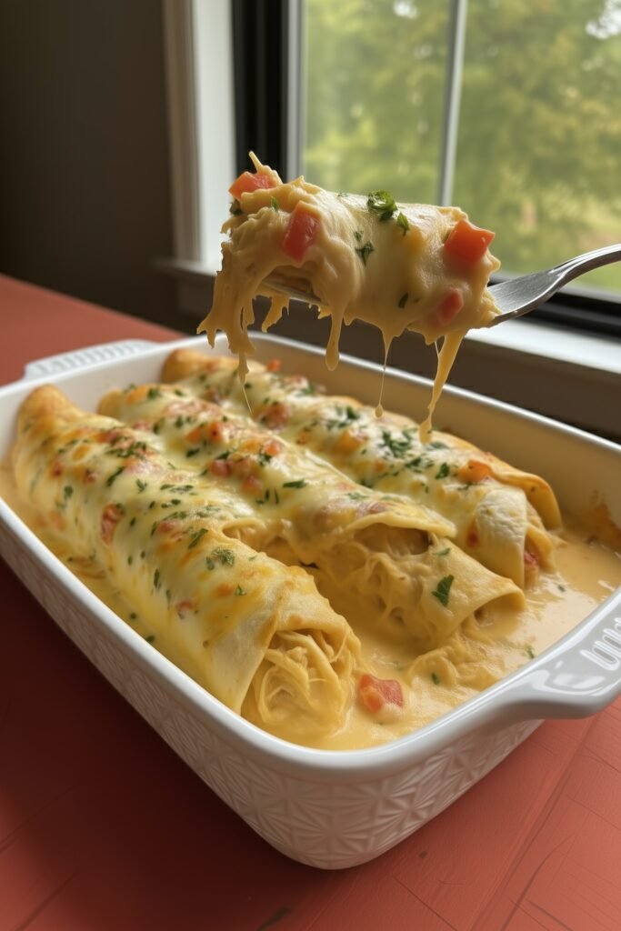 These chicken enchiladas feature tender shredded chicken, fire-roasted corn, and green chiles wrapped in soft