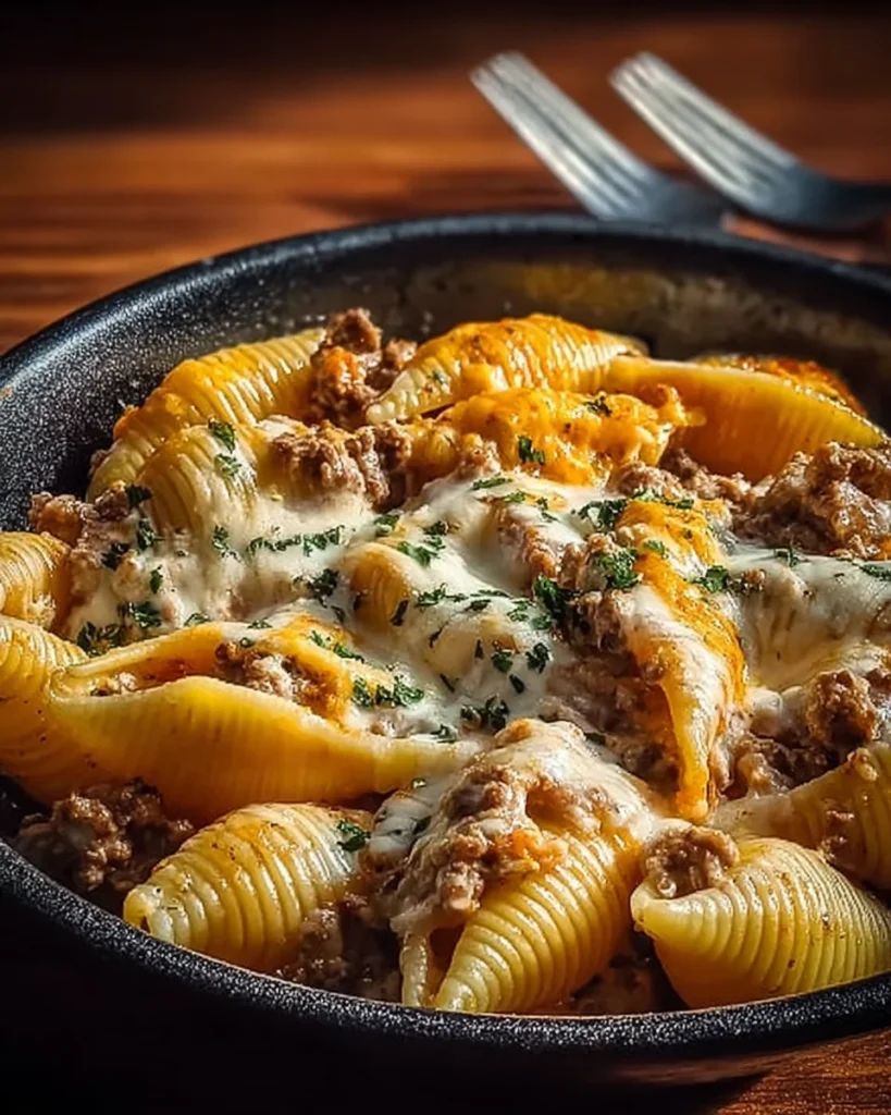 This crockpot cheesy ranch beef pasta shells recipe combines seasoned ground beef, tender pasta shells,