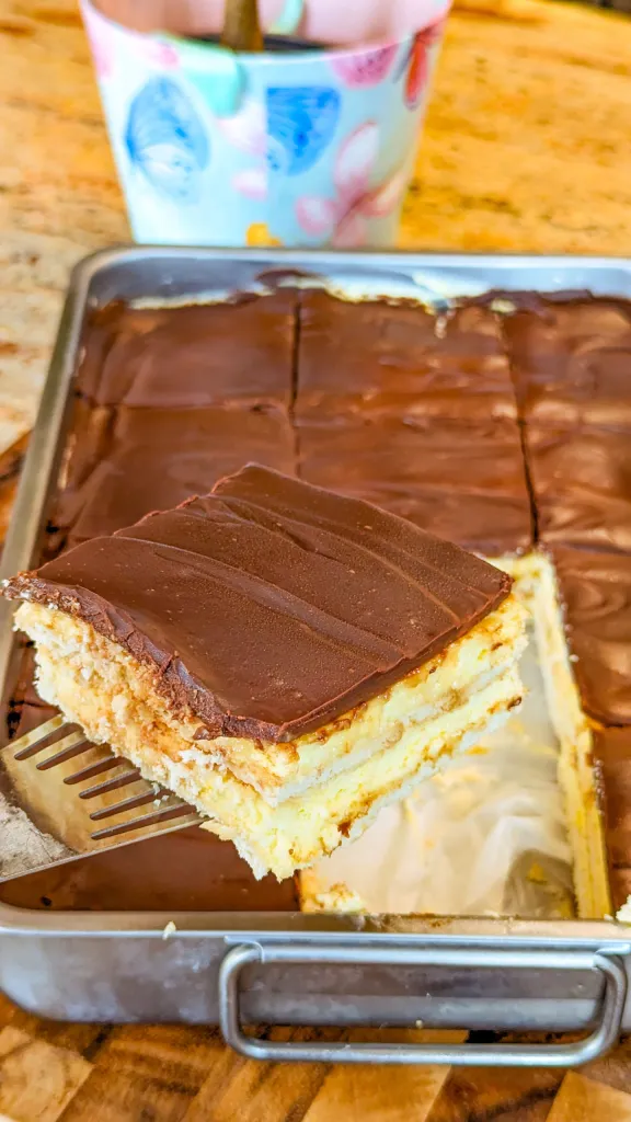 This no bake chocolate eclair cake replicates the classic French pastry’s signature layers—crispy graham crackers,