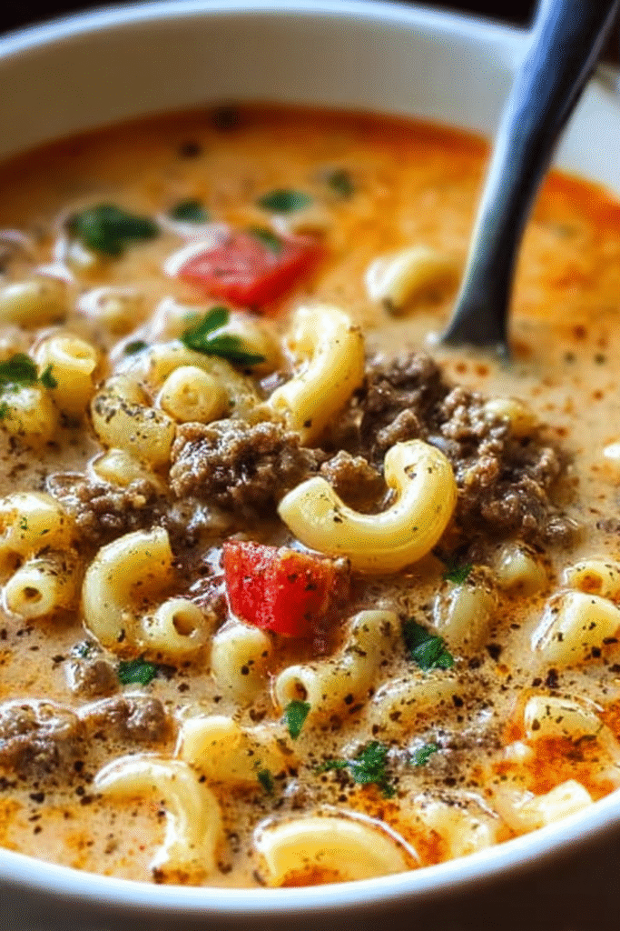 This hearty, comfort-driven soup ingeniously combines two beloved American classics—cheeseburgers and macaroni and cheese—into a