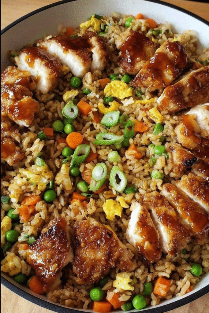 Crispy chicken and veggies tossed in Bang Bang sauce over fluffy fried rice with eggs.