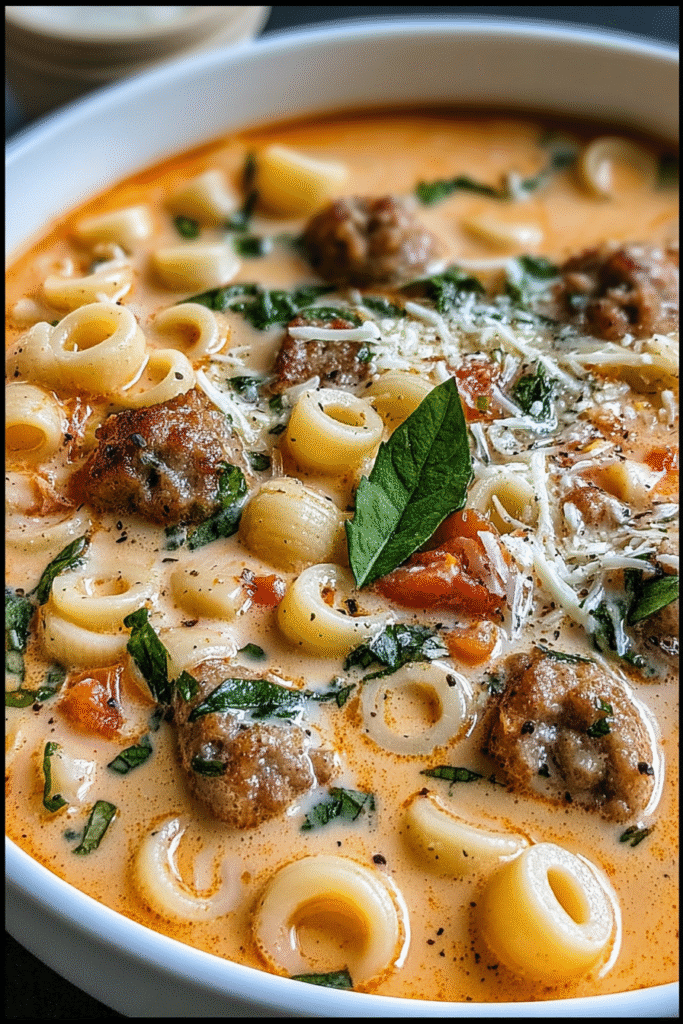 This luxuriously creamy soup combines the hearty richness of Italian sausage with tender pasta shells