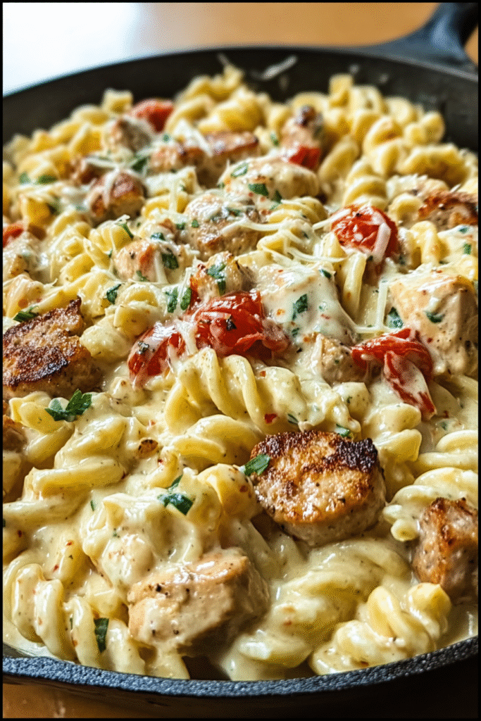 Creamy Pepper Jack Chicken & Sausage Pasta Skillet combines tender chicken cubes and smoky sausage