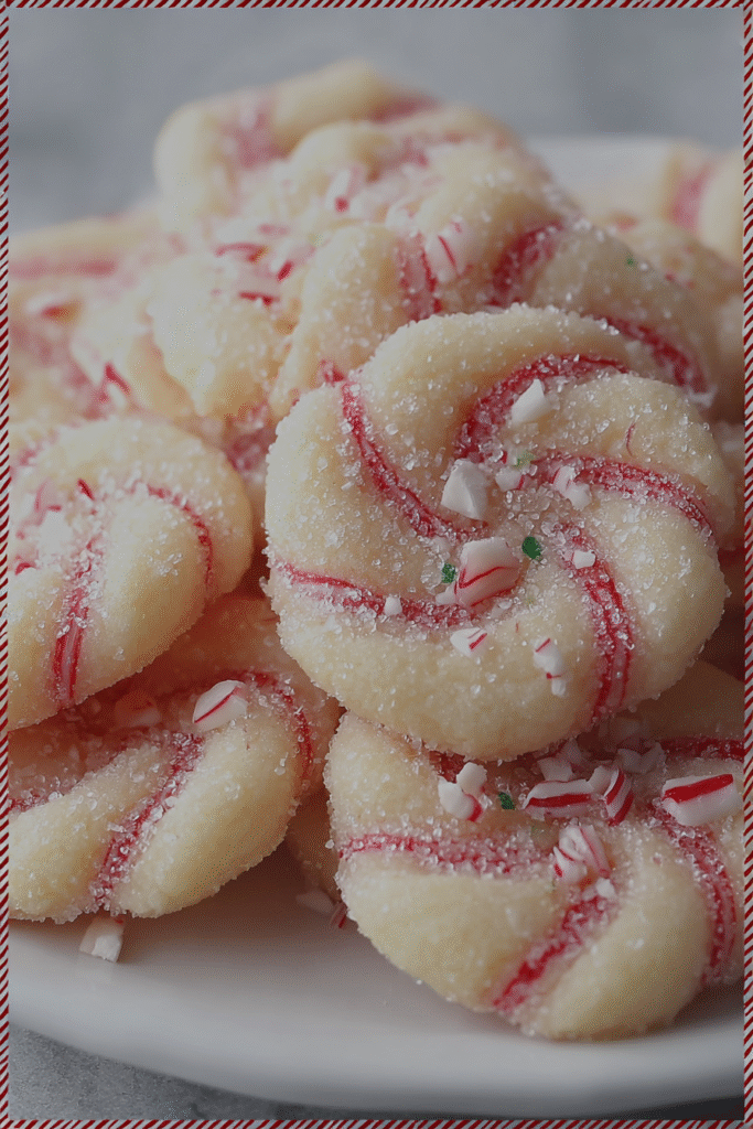 These charming, buttery cookies capture the iconic red-and-white striped appearance of candy canes through a