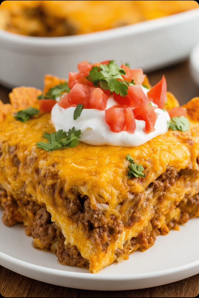 Dive into taco night reimagined with this Cheesy Dorito Taco Casserole—a crunchy, cheesy, flavor-packed layered
