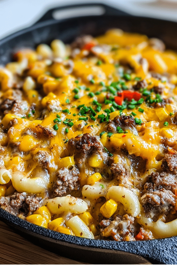 This hearty, one-pan comfort meal combines seasoned ground beef, tender potato cubes, sweet corn, and