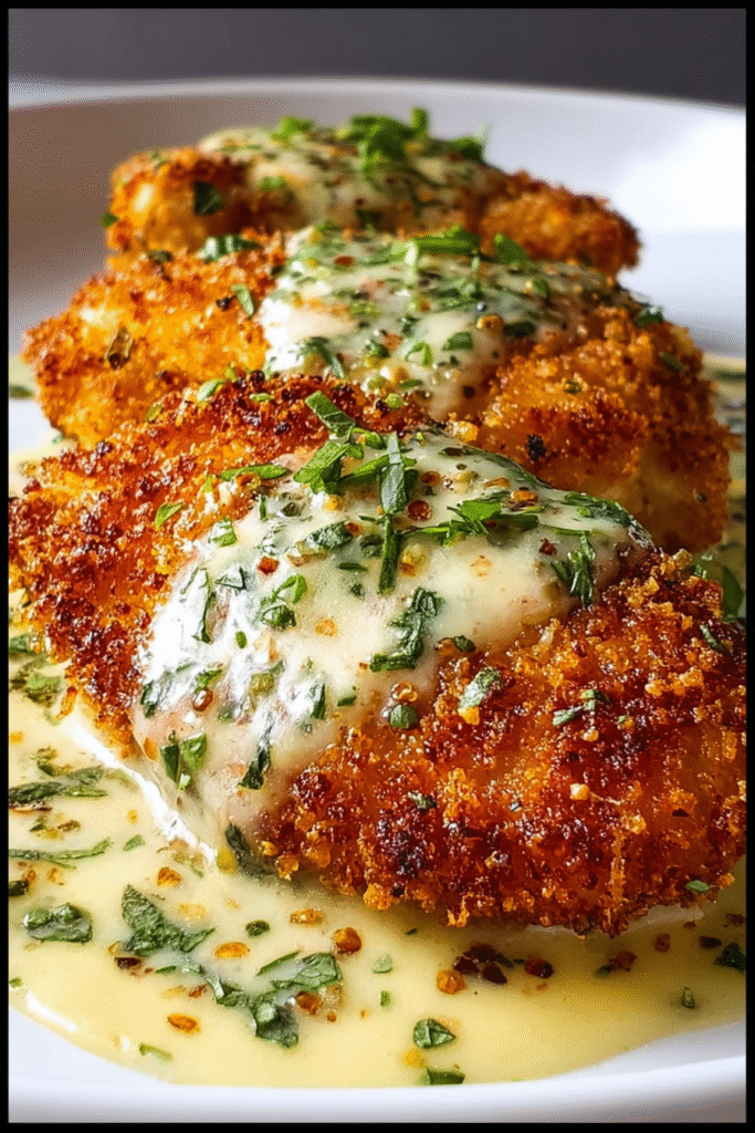 This beloved comfort classic combines crispy, golden-brown parmesan-breaded chicken breasts with a luxurious, silky garlic