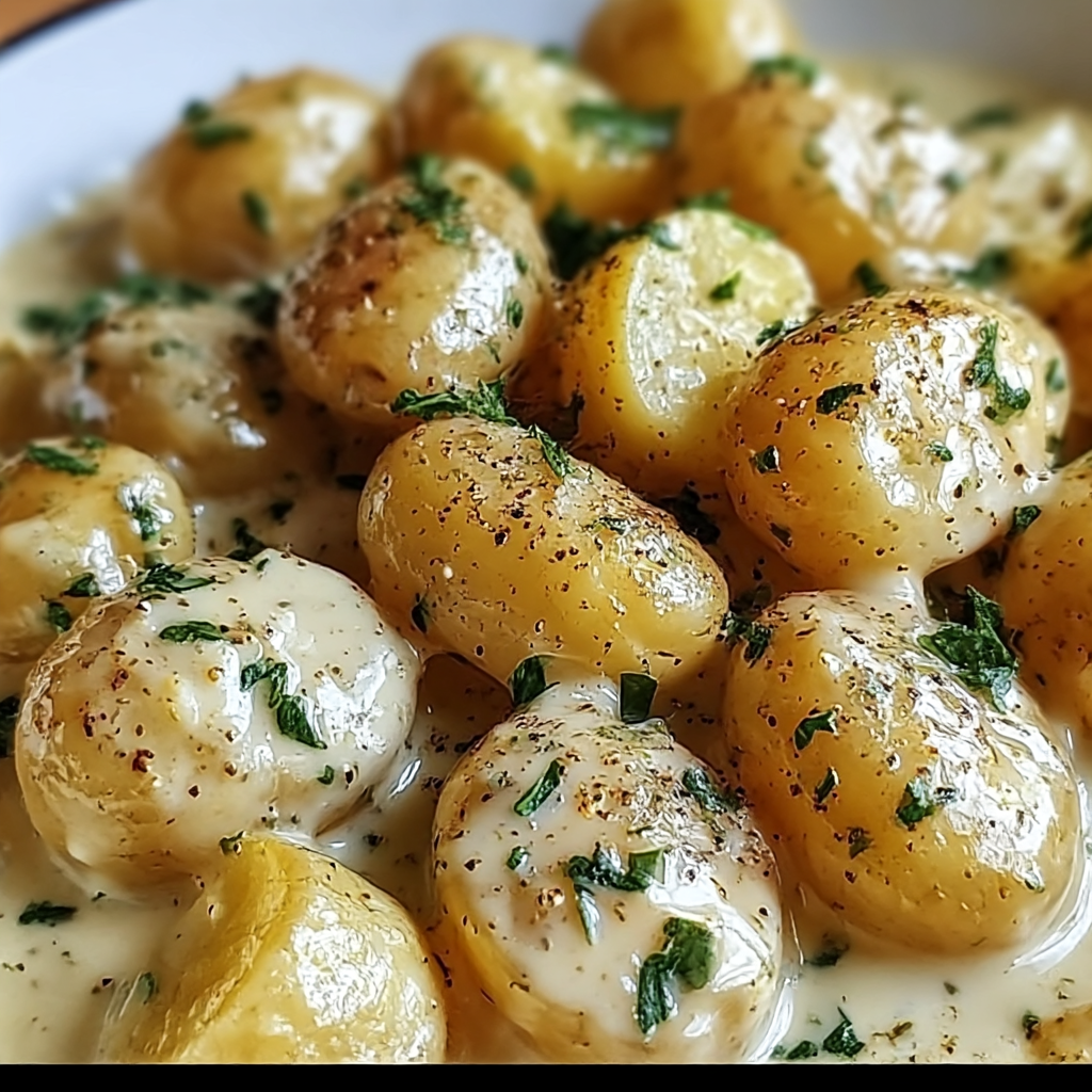 These golden, oven-roasted baby potatoes are elevated with a velvety garlic cream sauce made with