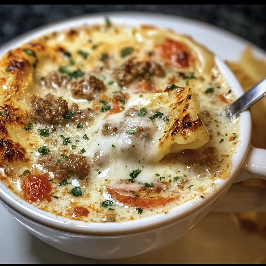 This Creamy Alfredo Lasagna Soup combines Italian sausage, mushrooms, and broken lasagna noodles in chicken