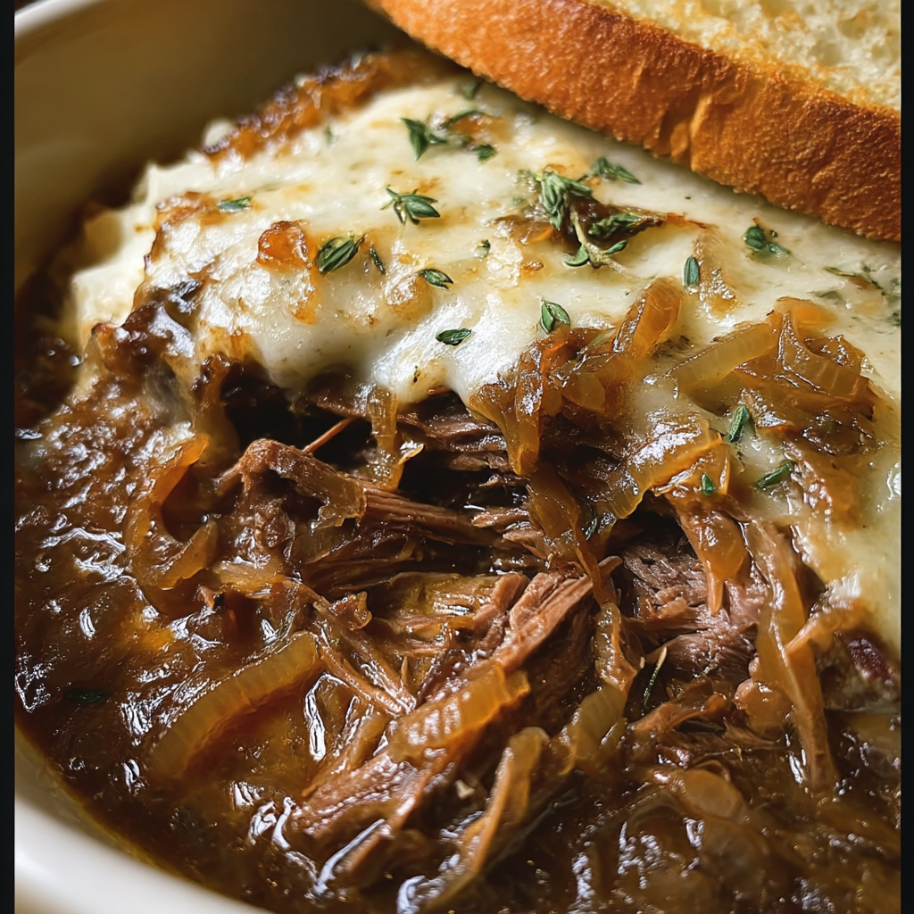 This French Onion Pot Roast combines chuck roast with caramelized onions, beef broth, and herbs