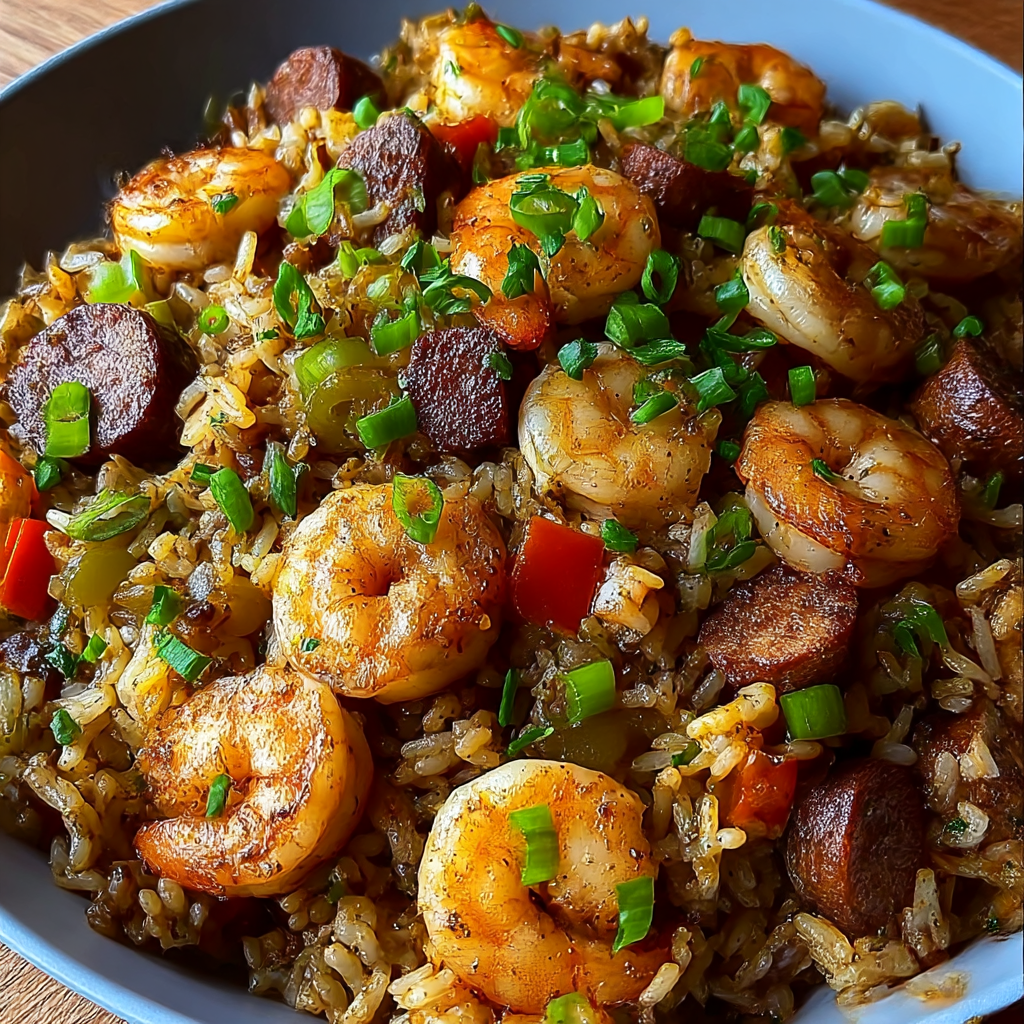 This Shrimp Dirty Rice Skillet combines ground beef, sausage, and shrimp with seasoned rice in