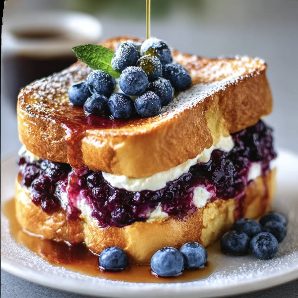 This Blueberry Cheesecake Stuffed French Toast combines cream cheese filling with fresh blueberries sandwiched between