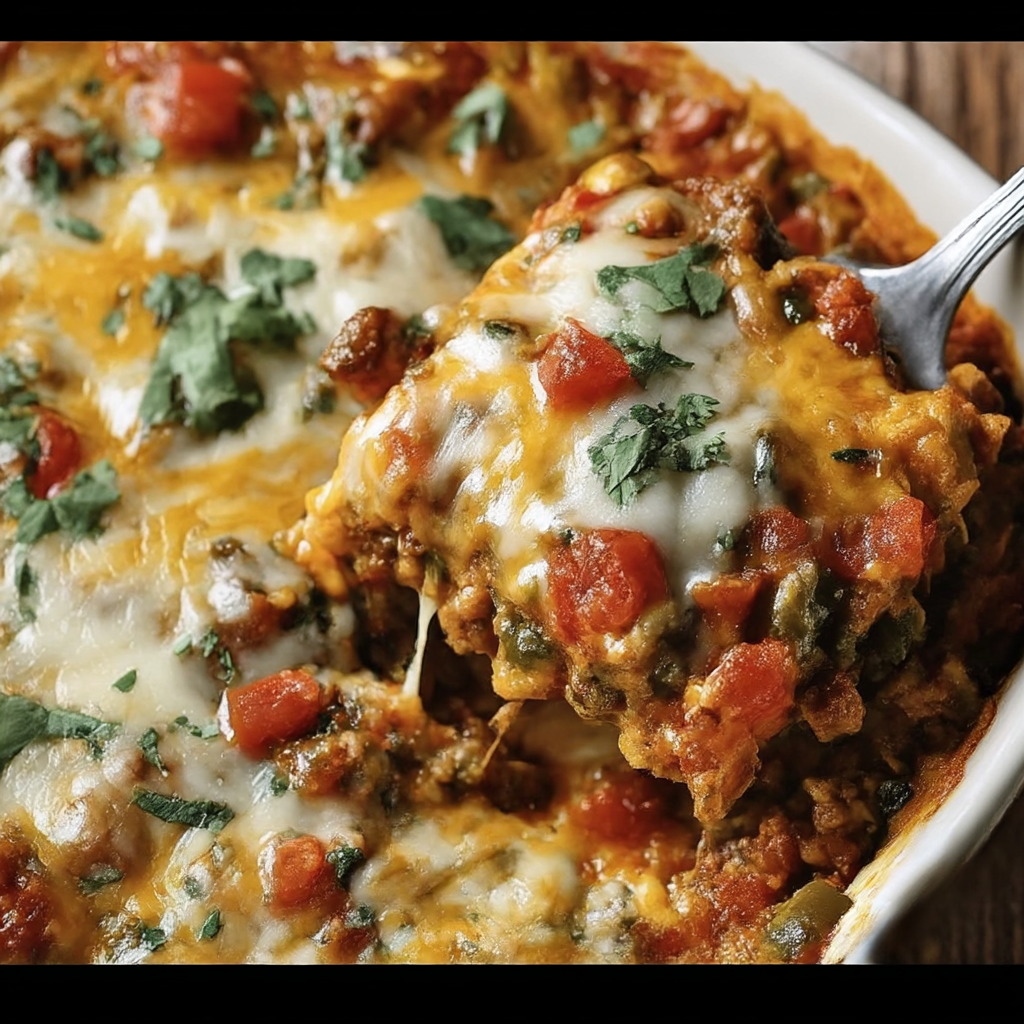 This Chili Relleno Casserole adapts the traditional Mexican dish of battered and fried stuffed peppers