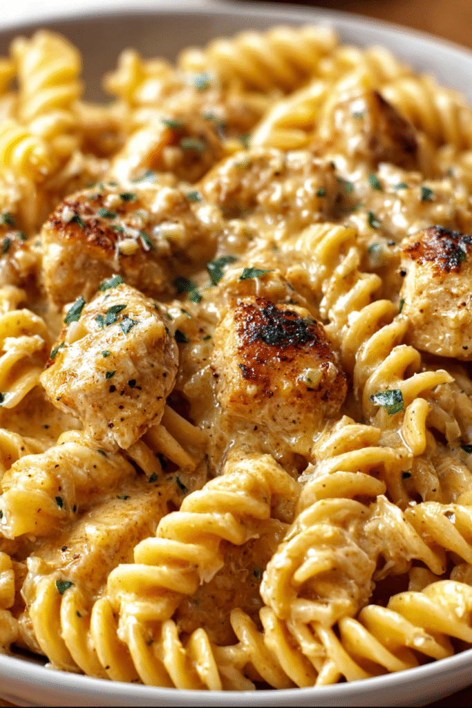 This bold, creamy pasta dish brings the vibrant flavors of Louisiana’s Cajun country straight to your dinner table with tender, spice-rubbed chicken and corkscrew rotini swimming in a luxurious garlic-infused cheese sauce. The magic happens when smoky Cajun seasoning meets rich heavy cream and two types of melted cheese, creating a sauce that’s simultaneously spicy, savory, and indulgently smooth. Each spiral of rotini captures pockets of that creamy, garlicky goodness, while the golden-seared chicken adds substantial protein and a satisfying contrast to the silky pasta, making this a complete meal that’s ready in just 35 minutes.