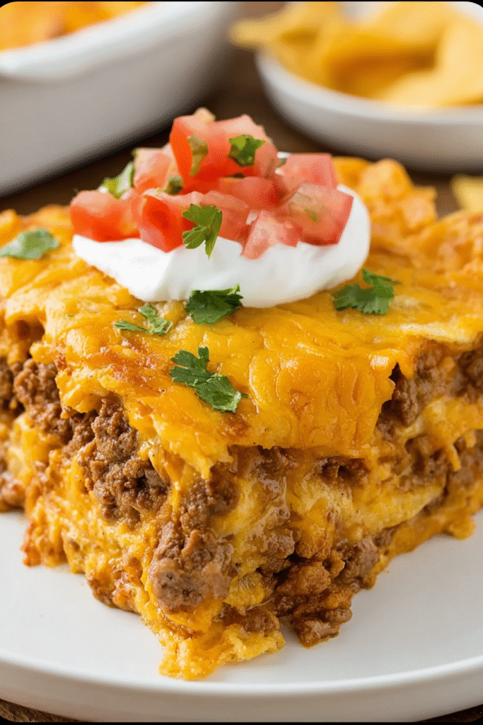 The genius of this casserole lies in the creative combination of familiar Tex-Mex flavors with the unique crunchy, cheesy properties of Doritos. The Doritos don’t just add textural contrast—they provide intense, concentrated cheesy flavor that permeates the entire casserole, especially as the chips slightly soften and absorb the beef and cheese flavors during baking. The taco seasoning provides a pre-balanced spice blend that instantly delivers authentic Tex-Mex character without measuring individual spices. Rotel tomatoes with green chilies add tangy complexity and mild heat that enhances without overwhelming the overall flavor profile. The combination of cheddar and Monterey Jack cheeses creates a balanced cheese profile—cheddar provides sharp, tangy flavor while Monterey Jack contributes creamy, stretchy texture and mild sweet notes. The sour cream layers provide tangy creaminess that cuts through the rich beef and cheese richness while adding moisture that prevents the casserole from being dry. The layering technique ensures every bite delivers a harmonious combination of textures and flavors—crunchy Doritos, seasoned beef, creamy sour cream, and melted cheese. At approximately 520-580 calories per serving, this is an indulgent comfort food, but the satisfying, hearty nature means a single serving is completely filling, especially when paired with a simple salad or vegetables.