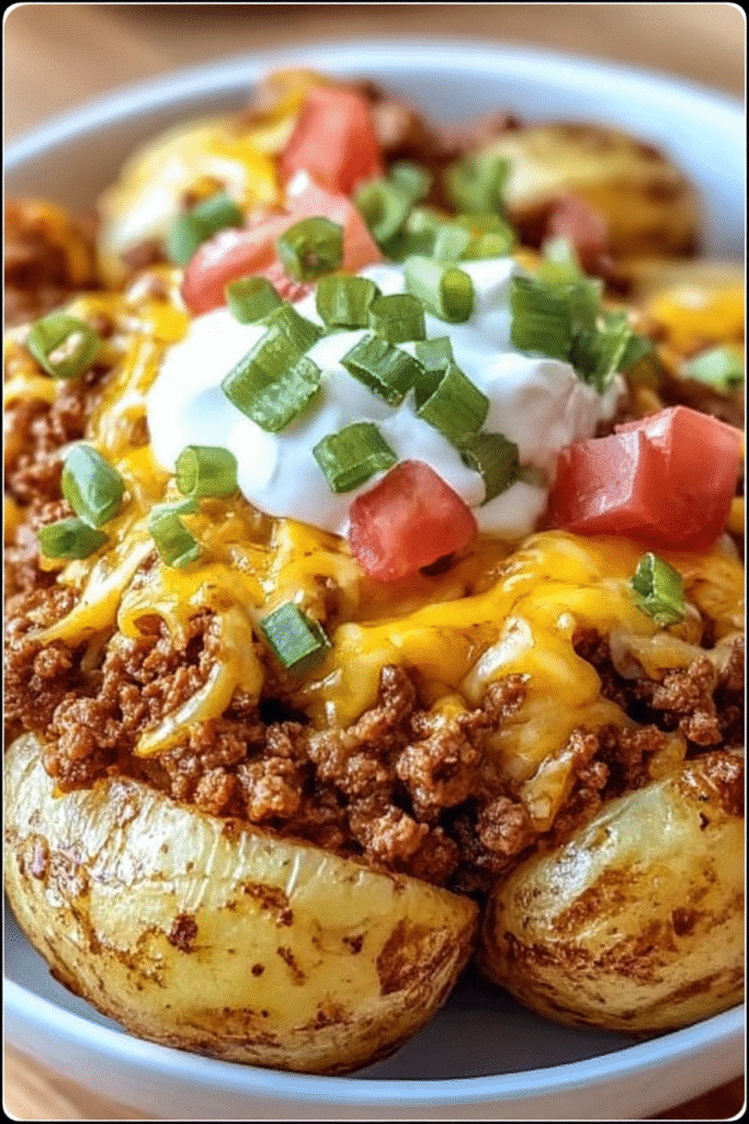 This recipe exemplifies practical, nutritious home cooking that transforms simple ingredients into complete, satisfying meal requiring minimal technical skill. The simultaneous roasting and meat cooking creates efficiency that keeps total time under one hour despite appearing more complex. At approximately 420-480 calories per serving with high protein content (25-30g depending on meat choice), this suits various dietary goals from muscle building to weight management when portion-controlled. The component-based assembly makes this excellent for meal prep—roast several pounds of potatoes and cook multiple batches of meat on Sunday, then assemble individual servings throughout week in minutes. For even lighter version, use sweet potatoes instead of regular potatoes for additional vitamins and fiber, choose 99/1 ground turkey, and use non-fat Greek yogurt to reduce calories to approximately 350-380 per serving. The customization potential through topping variations prevents flavor fatigue: try salsa, guacamole, pickled jalapeños, or different cheese varieties to create endless combinations. This suits families seeking budget-friendly meals using pantry staples and affordable proteins while providing balanced nutrition. The familiar taco flavors combined with comforting baked potato format creates hybrid dish that appeals to both adventurous and traditional eaters, making this reliable addition to regular dinner rotation rather than one-time novelty.