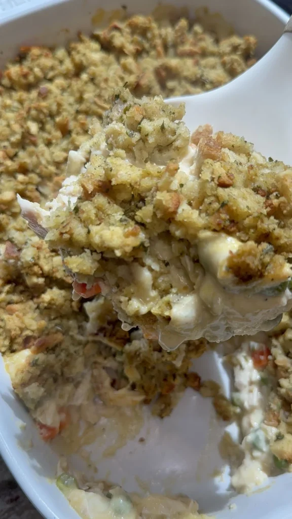 This cozy, one-pan dish delivers the comforting flavors of a holiday dinner without the hours of preparation. Tender shredded rotisserie chicken and colorful vegetables are simmered in a creamy, savory sauce, all hidden beneath a golden, herb-seasoned stuffing crust. It is a hearty, “stick-to-your-ribs” meal that combines convenience and nostalgia in every bite.