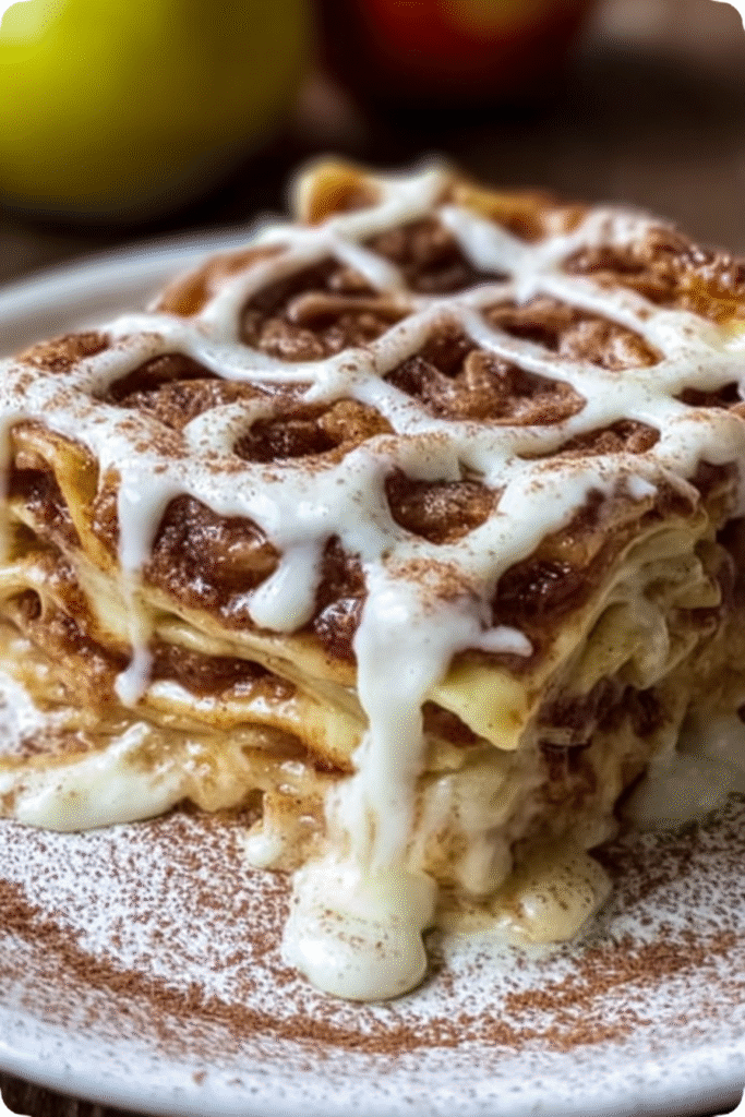 This Cinnamon Roll Apple Lasagna proves that impressive, bakery-worthy desserts don’t require professional training, expensive ingredients, or hours of labor—just creativity, convenience products used cleverly, and an understanding of how flavors and textures work together. By combining familiar elements in an unexpected format, you create something that feels both comforting and exciting, nostalgic and novel. While this is undeniably a rich, sweet indulgence, it’s the kind of dessert that brings people together, creates memories, and makes special occasions feel truly celebratory. The recipe’s flexibility allows endless variations based on seasonal fruit, dietary needs, or personal preferences, making it a valuable template you’ll return to throughout the year with different twists. Whether you’re hosting holiday brunch, contributing to a potluck, celebrating autumn’s apple harvest, or simply want to surprise your family with something special, this golden, layered, caramel-drizzled creation delivers comfort, joy, and deliciousness in every gooey, cinnamon-spiced, cream-cheese-laced bite.