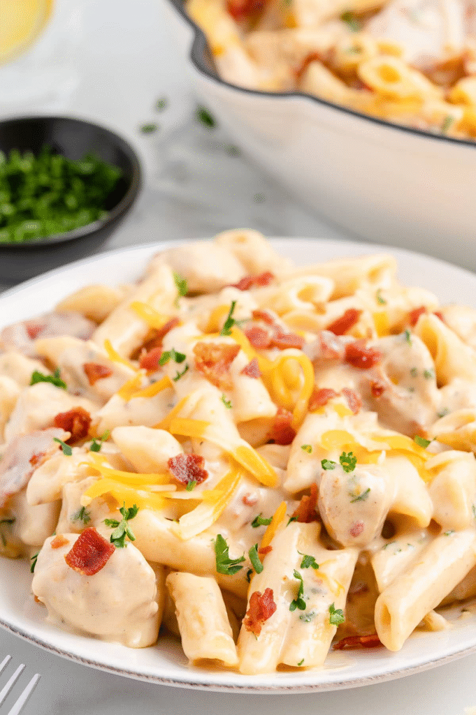 Cooking the pasta directly in seasoned chicken stock allows it to absorb flavor while releasing starch, naturally thickening the sauce. Cream cheese and cream of chicken soup create a smooth, creamy base, while ranch seasoning ties together the savory chicken and smoky bacon. Topping with melted cheese adds richness and texture for the ultimate comfort meal.
