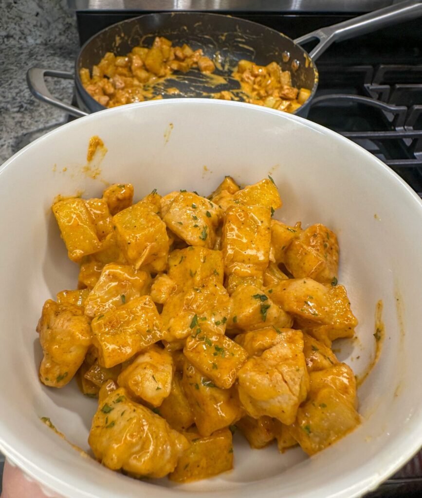 3. Sear the Chicken While the potatoes cook, heat a large skillet over medium-high heat. Add the diced chicken and season generously with the Cajun seasoning, garlic powder, onion powder, and paprika. Cook for 7 to 8 minutes, stirring occasionally, until the chicken is golden brown and reaches an internal temperature of 165°F. Remove the chicken from the skillet and set aside.