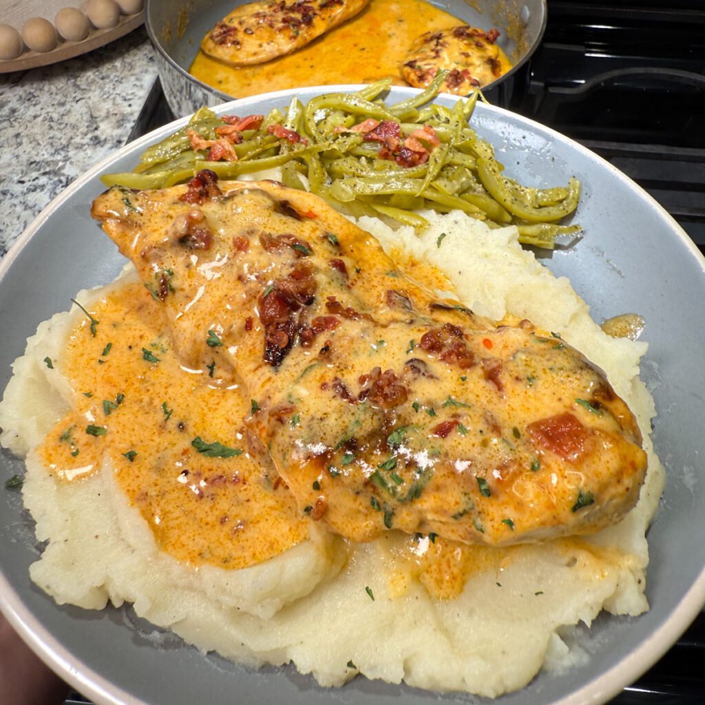 Nestle the cooked chicken cutlets back into the simmering sauce, spooning the cream over the meat to coat it. Top with the optional bacon bits and serve immediately while the sauce is at its peak consistency.
