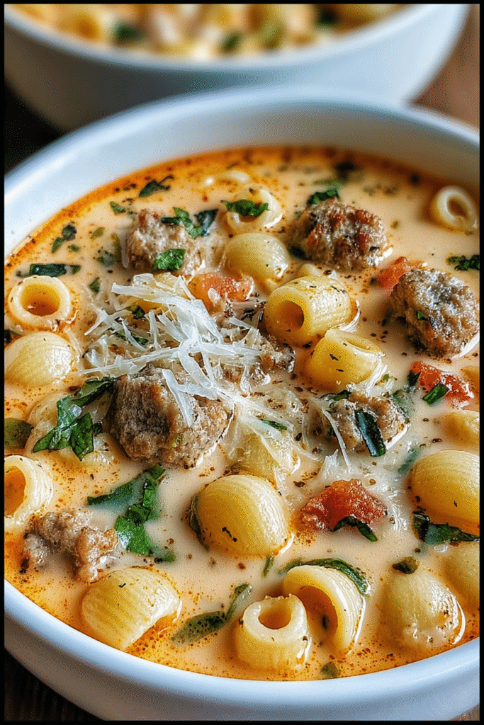 Creamy Parmesan Italian Sausage Ditalini Soup represents the perfect intersection of comfort, convenience, and sophistication—proving that restaurant-quality Italian flavors can emerge from your own kitchen with minimal time investment and straightforward techniques. This recipe demonstrates that impressive cooking doesn’t always require lengthy ingredient lists or complicated procedures; sometimes the most memorable dishes come from intelligently combining simple elements and allowing them to work together harmoniously. The one-pot method means you can produce this elegant soup even on hectic weeknights when doing dishes feels like an insurmountable task, while the 30-minute timeline ensures dinner can happen even when you’re starting from scratch at 6 PM. While the calorie count of 480-520 per serving is substantial, this is genuinely a complete meal that requires nothing more than bread and perhaps a simple salad to feel satisfying and balanced—the combination of protein, carbohydrates, and vegetables (if using spinach) creates a nutritionally complete plate in a single bowl. For those watching calories, you can reduce each serving to approximately 350-400 calories by using turkey Italian sausage, substituting half-and-half for heavy cream, using less pasta and more vegetables, and reducing the Parmesan—all while maintaining the essential creamy, comforting character that defines this soup. The customizable nature means you can adjust spice levels, add or omit vegetables, vary the pasta shape, or even make it low-carb, ensuring this recipe adapts to your family’s preferences and dietary needs rather than requiring you to adapt to it. Whether you’re seeking a quick weeknight dinner, a warming winter meal, an impressive but easy dish for casual entertaining, or simply craving that particular comfort that only creamy soup can provide, this Creamy Parmesan Italian Sausage Ditalini Soup delivers on every promise—proving once again that some of the best recipes are those that make both the cooking and the eating equally rewarding, nourishing both body and soul with minimal fuss and maximum flavor.